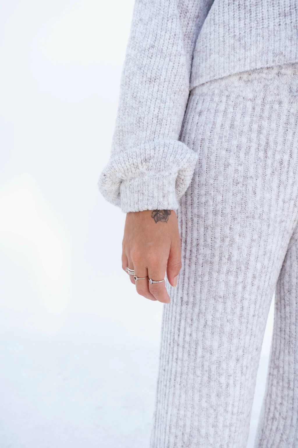 Confeccionado em tricot, o conjunto possui padronagem canelada, modelagem cropped na blusa, pantalona na calça, e gola alta.